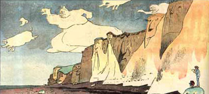 Vieles in «Kin-der-Kids» kommt formal richtiggehend frühexpressionistisch daher, etwa das langgezogene schwarze Dreieck der berockten Tante sowie voluminös-eckig verdrehte Wolkentürme oder bizarre Stadt- und Felslandschaften. Wohl alles zu bizarr für die damalige us-amerikanische Leserschaft, weshalb man sich des Eindrucks nicht erwehren kann, Feininger sei für «Wee Willie» sowohl inhaltlich als auch formal zurückgepfiffen worden. Der Zeichner inszenierte den Animismus von «Wee Willie Winkie’s World» auf stupend stimmungsvolle und vom Jugendstil beeinflusste Art und Weise, was gegenüber dem progressiven Expressionismus von «Kin-der-Kids» ein stilistischer Rückschritt war.